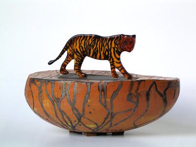 | Verre découpé selon les nervures, émaillé et thermoformé. Tronc et socle ornés en raku. | |