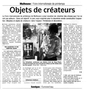Participation à une exposition commune avec treize autres artistes et créteurs à la Foire Internationale de Mulhouse.